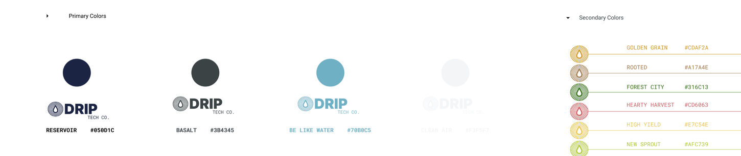 Rooted in water and plant life, the palette balances trust, vitality, and grounded optimism. Deep tones (Reservoir, Brush) convey reliability and environmental care. Lighter tones (Crest, Haze) bring clarity and environmental focus. Warmer accents (Heavily Harvest, High Yield) add energy and approachability, reinforcing DRIP's connection to growth outcomes and agricultural productivity.